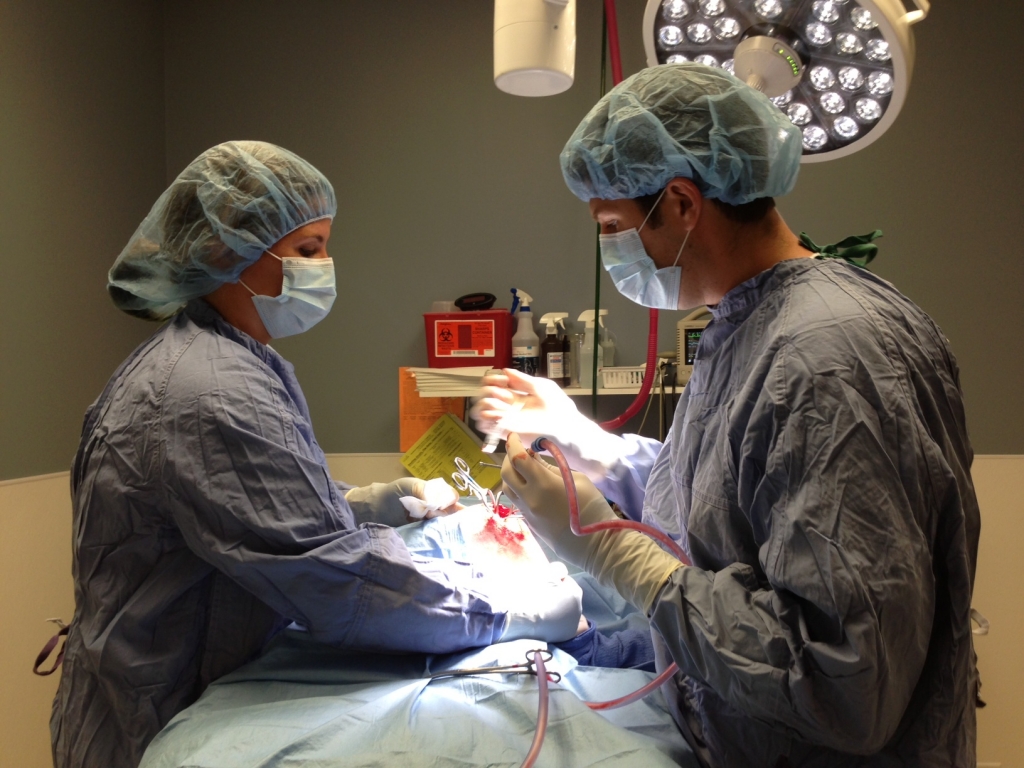 All pets are intubated with a breathing tube in their windpipe. This allows us to maintain their airway and deliver anesthetic gas and oxygen. All pets are hooked up to surgical monitors monitoring their heart rate, blood oxygenation levels, EKG, blood pressure and respirations. In addition to the “gadgets” we have a dedicated veterinary technician monitoring your pet’s vital signs. All surgeries include balanced pain management before and during surgery, as well as after. All surgeries have IV catheters placed to have vascular access and to deliver fluids. This keeps your pet hydrated and helps keep their blood pressure normal. All surgical instruments and drapes are sterile and new ones are used for each surgery. Our standards and surgical equipment are the best available.